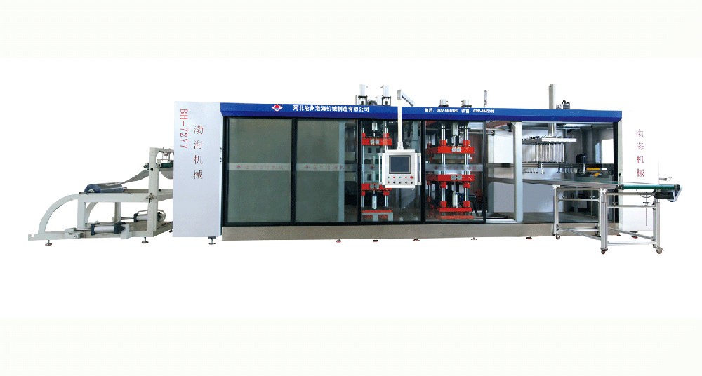 A, the function and characteristics:1. Mechanical, pneumatic, electrical integration. Every action is controlled by PLC program. Touch screen operation, simple and convenient.2. Coordinate is negative pressure molding.3. The upper and lower die forming method.4. The server to send piece, infinite le